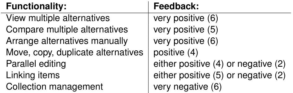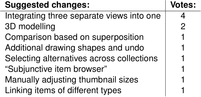 In the second study, the prototype was evaluated using an analytical method based on the Cognitive Dimensions (CD) framework by Blackwell, Green, et al. For each of the dimensions (visibility, juxtaposability, hidden dependencies, error-proneness, and abstraction gradient), CAMBRIA was assigned a descriptive score such as “good”, “adequate”, “poor”, and “non-existing”. The latter two scores (“poor” and “non-existing”) called for design interventions indicated in the rightmost column of the table below.
